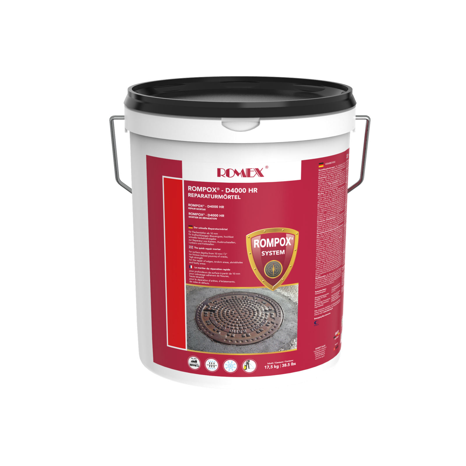 ROMPOX® - D4000 HR este un mortar de reparație bicomponent cu rezistență mare, reprezentând soluția modernă pentru întreținerea și renovarea drumurilor în construcția de drumuri. D4000 HR este utilizat pentru etanșarea fisurilor și pentru repararea suprafețelor de asfalt și a rupturilor pe elementele de beton. Mortarul de reparație extrem de reactiv poate fi utilizat chiar și iarna la temperaturi de până la -10 °C. Datorită reactivității sale ridicate, suprafețele pot fi redeschise într-un timp foarte scurt.