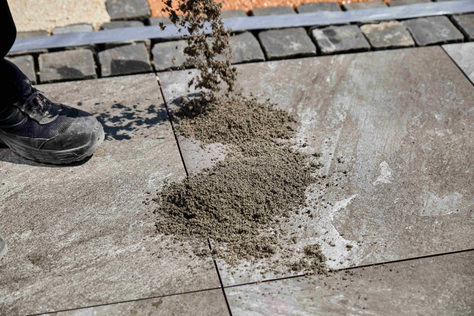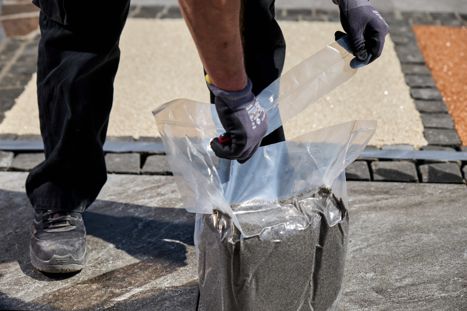 Aplicare: Deschideți capacul găleții, scoateți sacul vidat, tăiați-l și turnați imediat mortarul de îmbinare a pavajului în porțiuni pe suprafața pre-umezită. Apoi utilizați un jet de apă ușor și o racletă de cauciuc pentru a introduce continuu și intensiv mortarul în îmbinări cu multă apă, pentru a asigura umplerea completă a îmbinărilor. Nu este necesară o compactare suplimentară. Reziduurile de mortar sunt clătite de pe suprafață cu un jet fin de apă fără să se spele îmbinările.