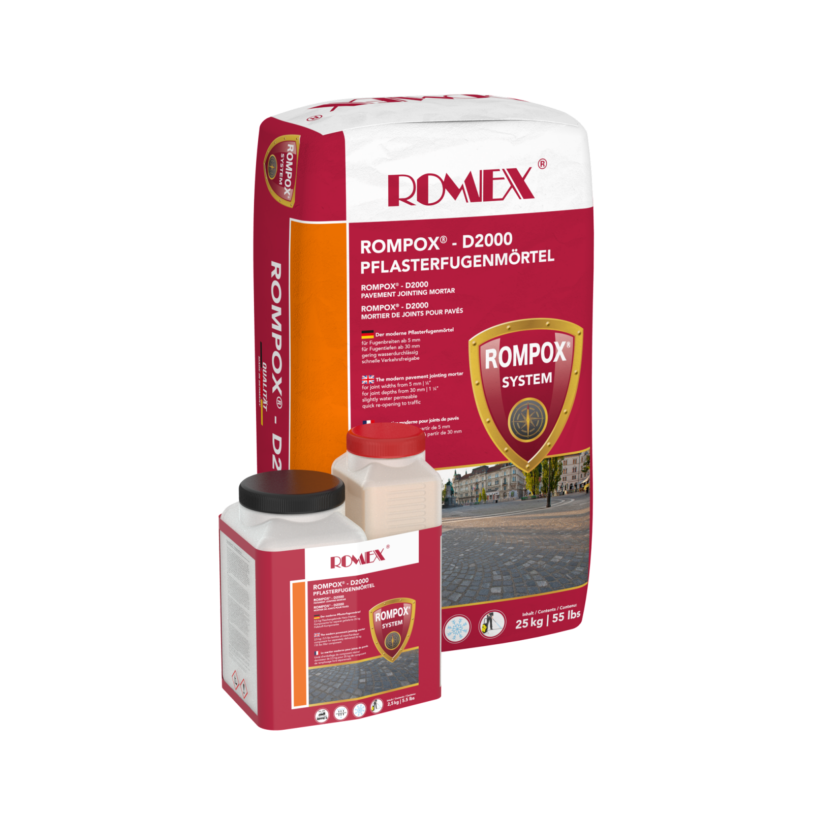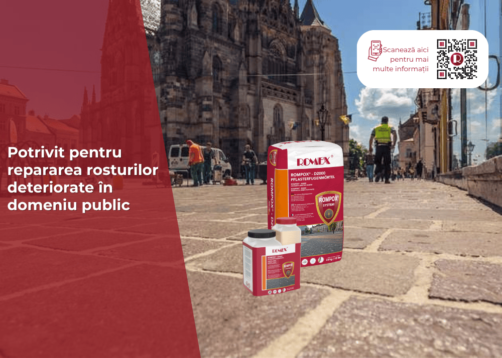 ROMPOX® - D2000 este un mortar de rosturi pentru pavare, destinat îmbinării suprafețelor intens utilizate în zonele publice. Este adecvat pentru îmbinarea nouă a piețelor, drumurilor și căilor, precum și pentru renovarea suprafețelor pavate existente și ca mortar de borduri în conformitate cu ATV DIN 18318:2019, de la o lățime a rostului de 5 mm. Este deosebit de remarcabilă deschiderea rapidă pentru trafic după instalare. ROMPOX® - D2000 are proprietăți de procesare foarte bune și îndeplinește toate cerințele pentru categoriile de utilizare N1-N3 în conformitate cu ZTV-Wegebau, precum și DIN 18318:2019 și RStO.