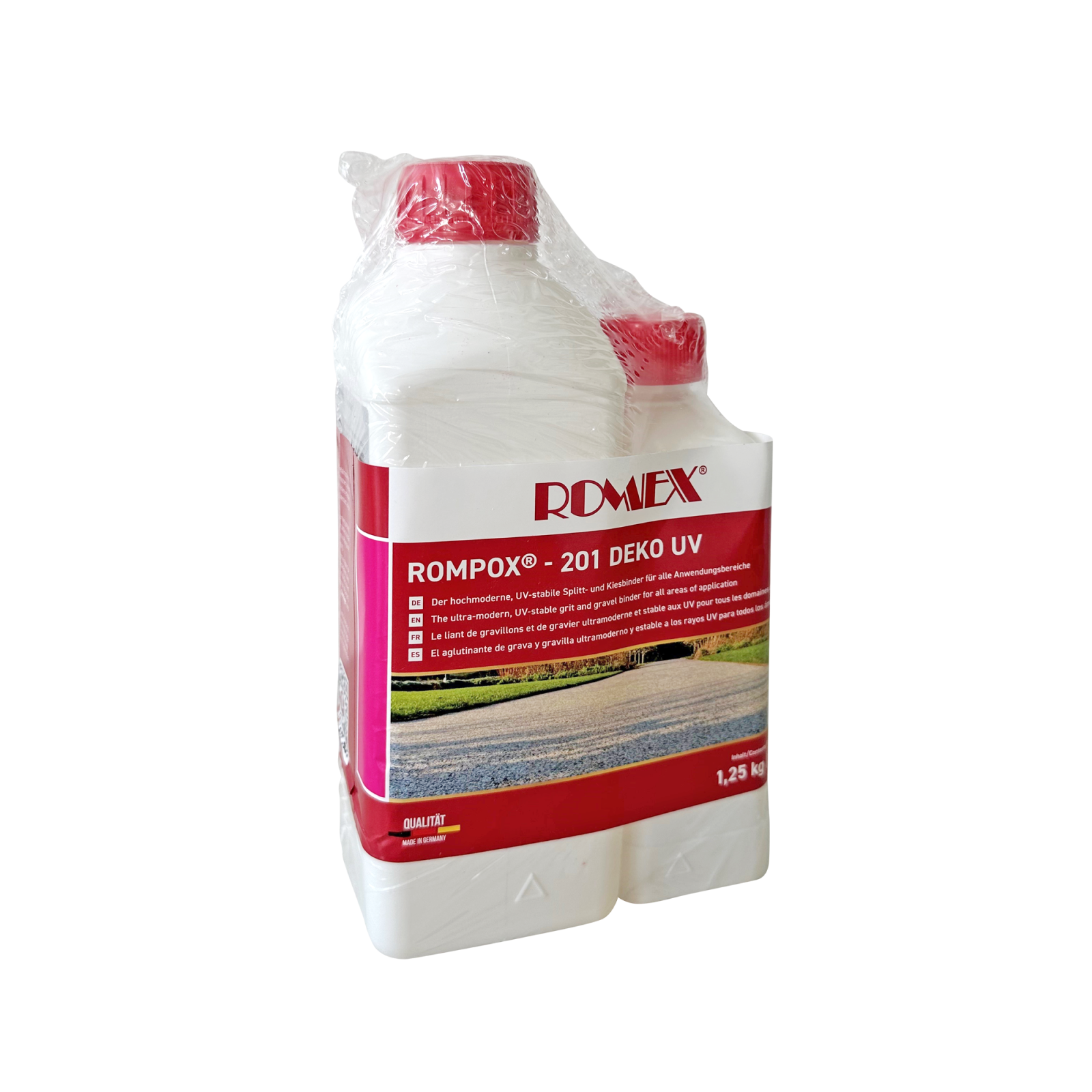 ROMPOX® – 201 DEKO UV este un sistem bicomponent de înaltă calitate pentru compactarea practic a tuturor tipurilor de pietriș de orice culoare. Liantul pentru pietris se caracterizează printr-o rezistență 100% la UV și valori de rezistență foarte ridicate. ROMPOX® – 201 DEKO UV permite crearea de suprafețe durabile, chiar și pentru construcția de alei fără bariere. Datorită permeabilității sale extrem de ridicate la apă, aceste suprafețe contribuie la îndepărtarea durabilă a etanșărilor de suprafață. Compactarea previne îndepărtarea și împrăștierea așchiilor sau pietrișului, reducând cerințele de întreținere și permițând curățarea rapidă și ușoară cu o mătură, o suflantă de frunze sau un aparat de spălat cu presiune.